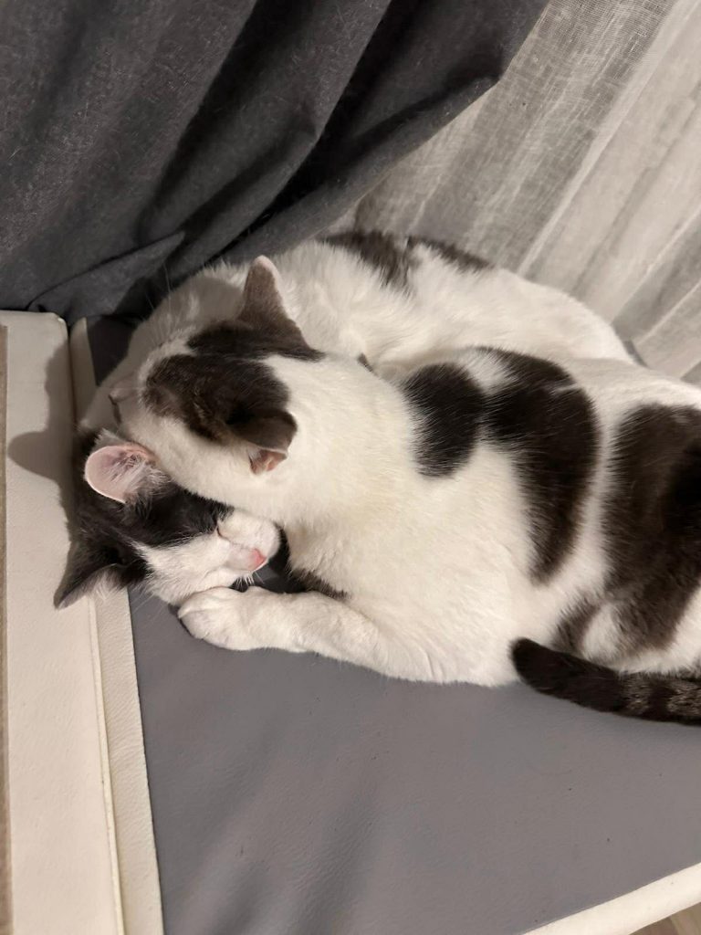 Entre eux ils sont vraiment fusionnel se cherchent si l’un change de pièce (miaule), dorment ensemble pratiquement tout le temps, se toilettent quotidiennement, jouent tout le temps ensemble. Milo & Mila sont donc inséparables et cherchent une famille pour la vie ensemble.